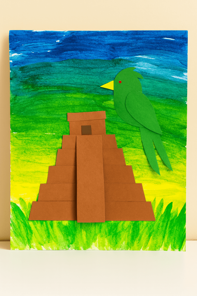 Including a quetzal craft for kids alongside the pyramid helps connect the activity to Guatemala’s identity and natural heritage.